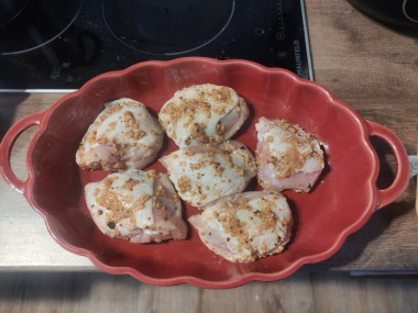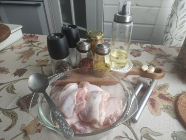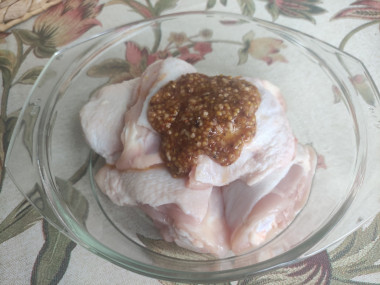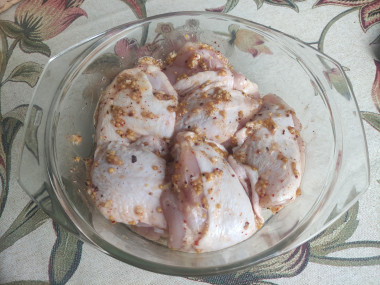 Бедра подготовила, промыла и обсушила. В мисочке приготовила маринад - смешала растительное масло, горчицу, соль и специи. Натерла бёдрышки маринадом и оставила пропитываться в холодильнике на 3 часа. Бедра запекала в духовке при 190 градусах, в моей духовке это заняло около 50-ти минут.