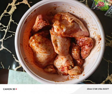У меня были куриные окорочка (почти 2 кг). Я разделила их на голени и бëдра. Приготовить маринад не составило никакого труда. Орегано и смеси трав у меня не было, вместо них добавила немного сушеного сельдерея.