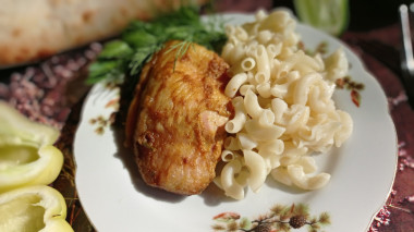 Куриные бедра хорошо сочетаются с пастой разных видов:Макароны (можно подавать с соусом на базе сливок, томатов или грибов).