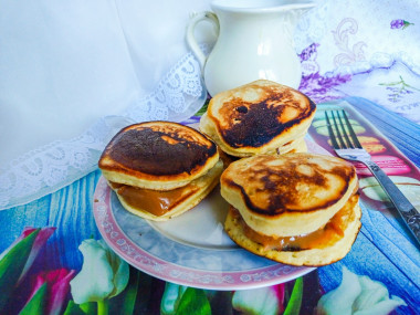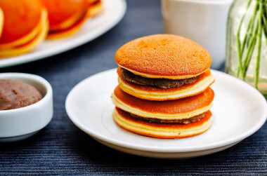 Готовые блинчики сложите попарно, промазывая их вареной сгущенкой. Традиционно в качестве начинки используют бобовую сладкую пасту. Также подойдут шоколадная паста, джем, обычная сгущенка.