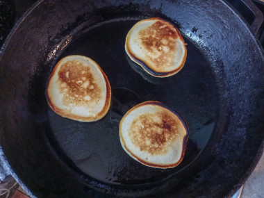 Разогрейте на сильном огне сковороду, лучше антипригарную. Смажьте ее каплей растительного масла без запаха. Масло понадобится только перед первым блином, больше смазывать не нужно. Аккуратно выложите тесто, формируя круглый блинчик. Размер у японских блинчиков может быть разный, но чаще их жарят небольшими.