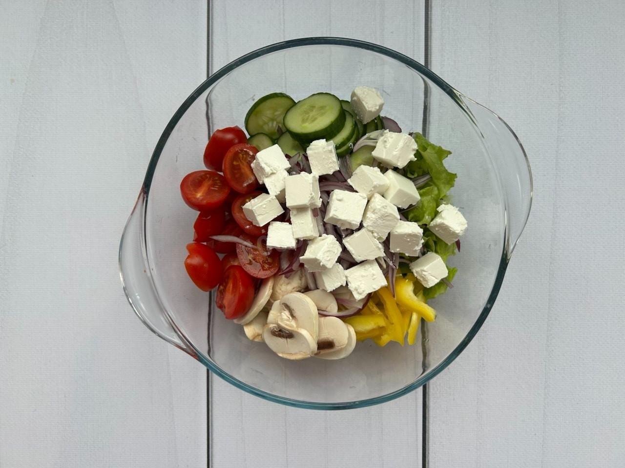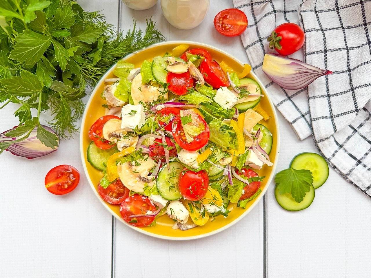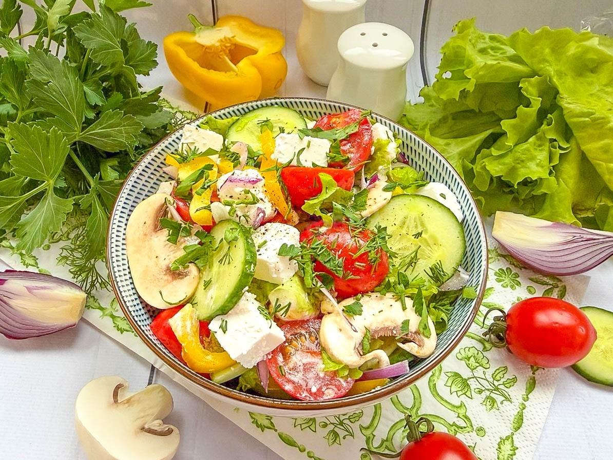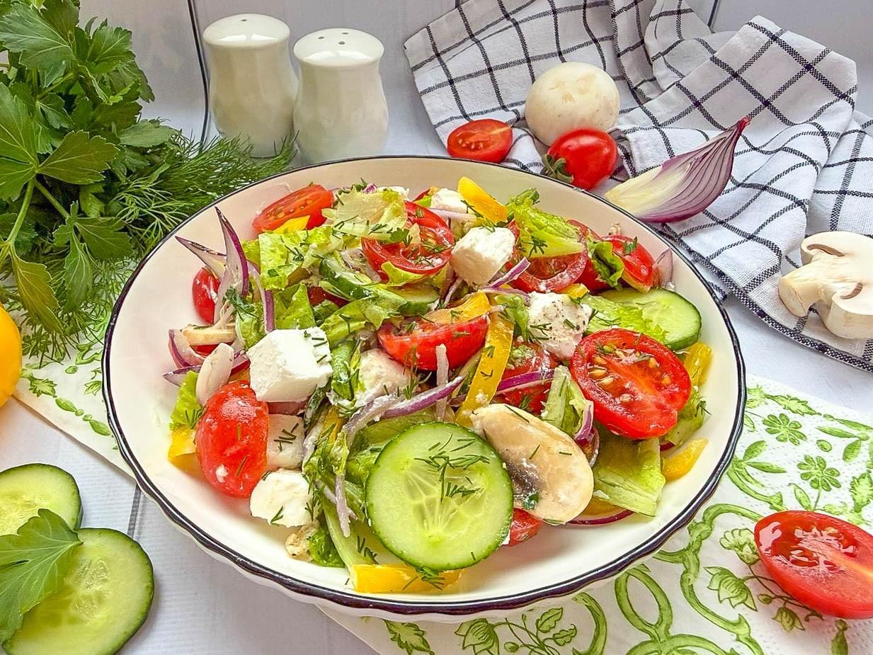 Овощи, грибы и листья салата тщательно помойте и обсушите бумажным полотенцем. Нарежьте листы крупными фрагментами или порвите руками кусочки желаемого размера. Помидоры разрежьте пополам, огурцы кружочками, болгарский перец и лук перьями. Шампиньоны нарежьте тонкими пластинками, сыр небольшими кубиками.
