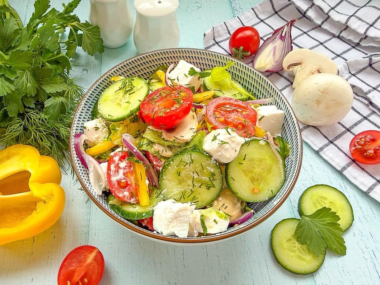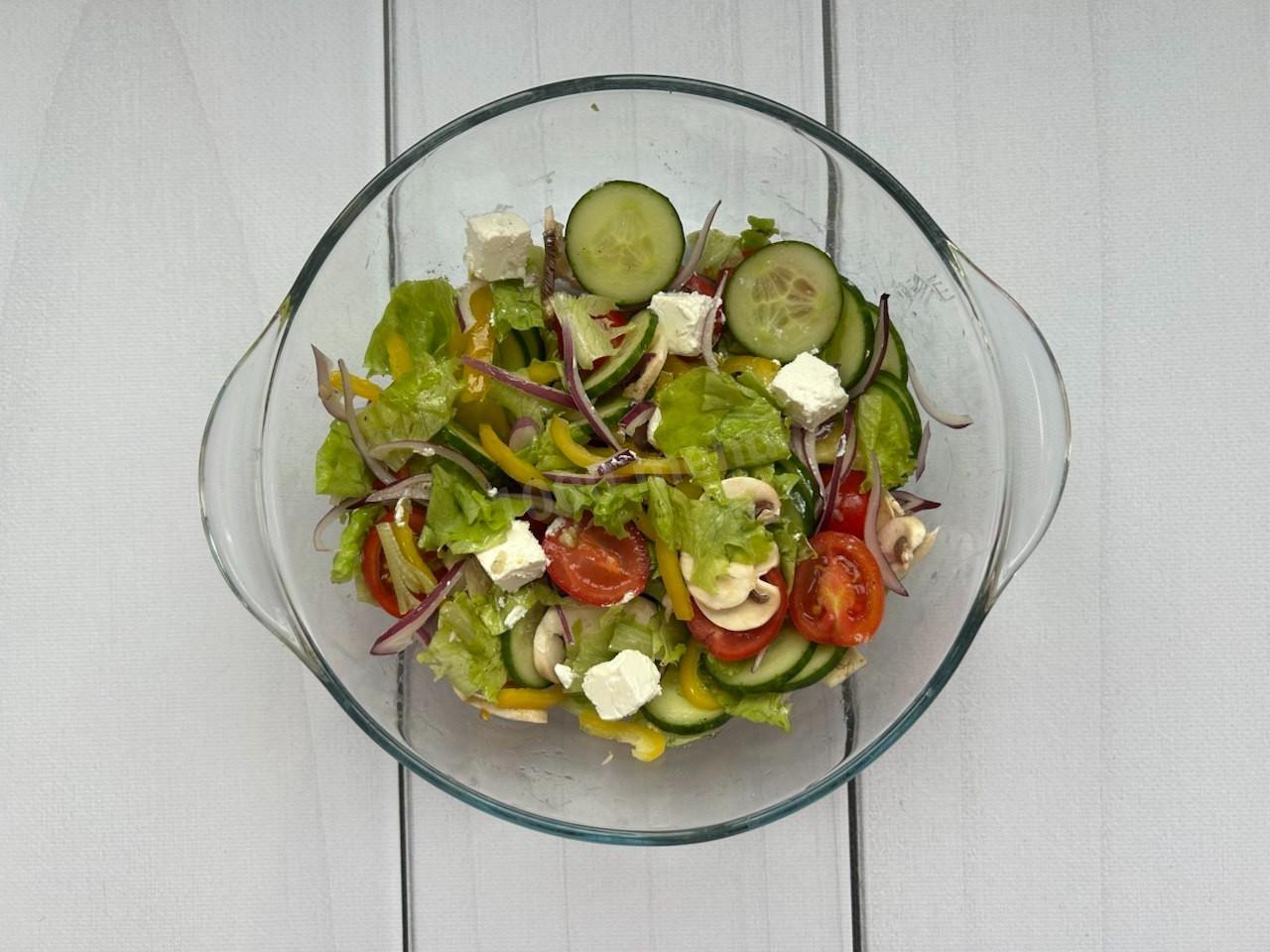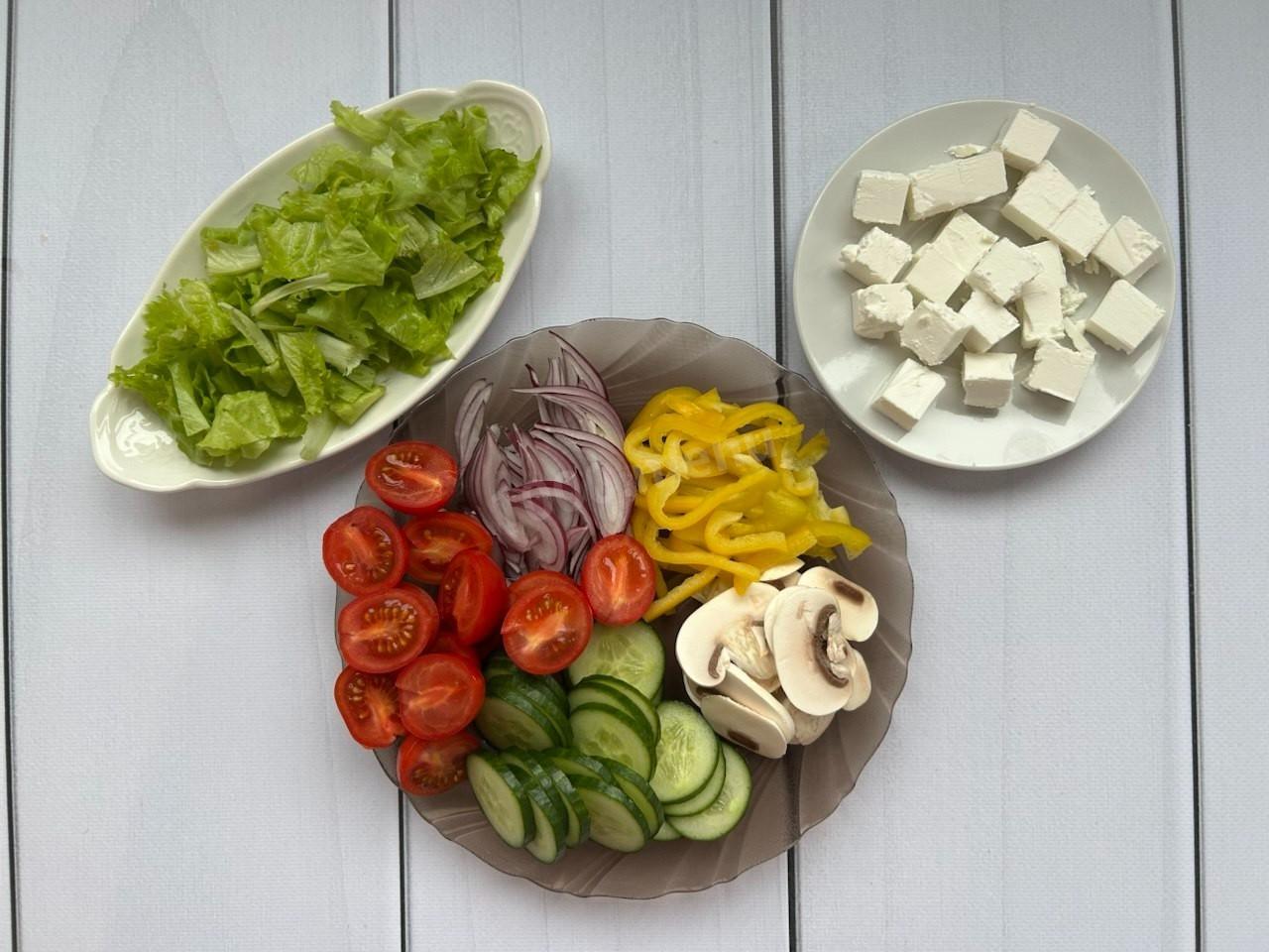 Овощи, грибы и листья салата тщательно помойте и обсушите бумажным полотенцем. Нарежьте листы крупными фрагментами или порвите руками кусочки желаемого размера. Помидоры разрежьте пополам, огурцы кружочками, болгарский перец и лук перьями. Шампиньоны нарежьте тонкими пластинками, сыр небольшими кубиками.
