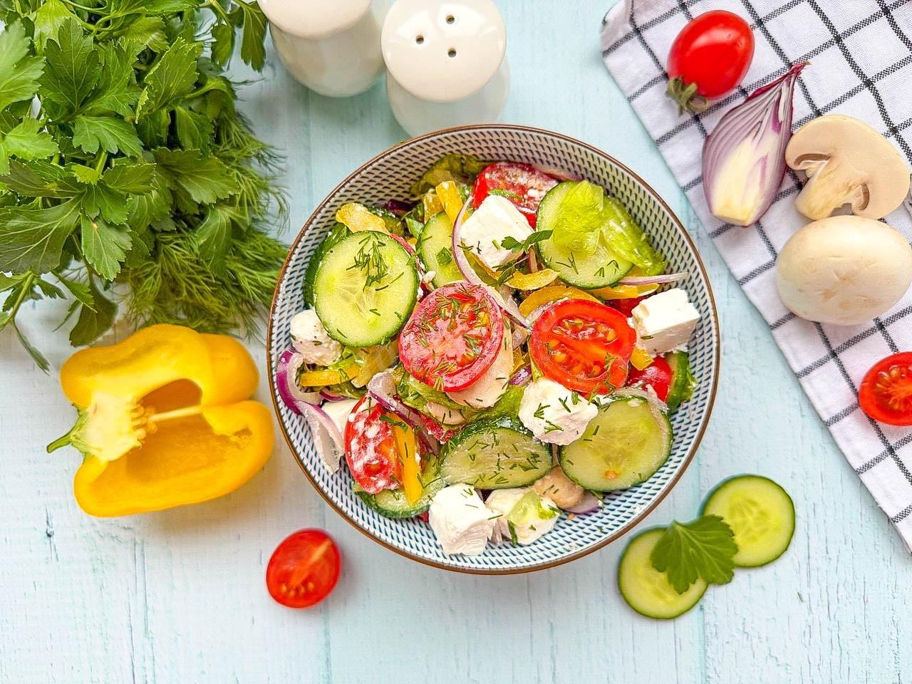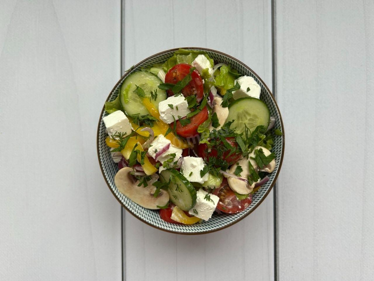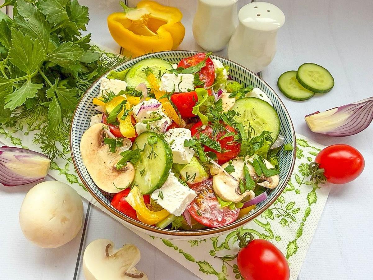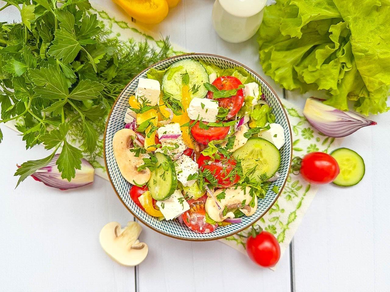 Овощи, грибы и листья салата тщательно помойте и обсушите бумажным полотенцем. Нарежьте листы крупными фрагментами или порвите руками кусочки желаемого размера. Помидоры разрежьте пополам, огурцы кружочками, болгарский перец и лук перьями. Шампиньоны нарежьте тонкими пластинками, сыр небольшими кубиками.