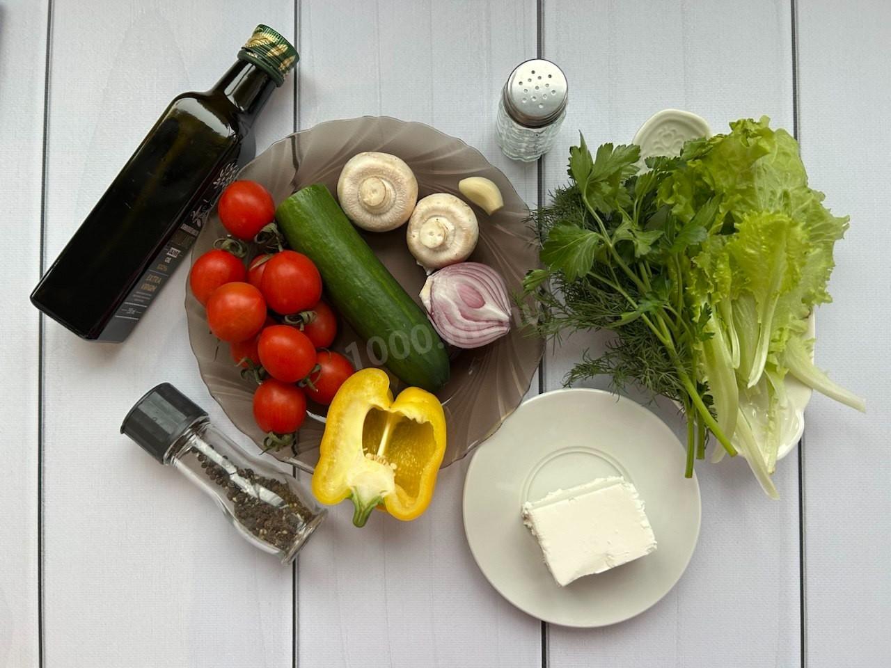 Как сделать салат овощной с сыром? Для начала подготовьте все необходимые ингредиенты. Сыр можете использовать любой, хорошо подойдёт сыр моцарелла(шарики) или греческий сыр. Грибы для салата не будут подвергаться термообработке, поэтому шампиньоны лучше использовать свежие ровные без вмятин. Лук используйте красный, он идеально подходит для овощных салатов.