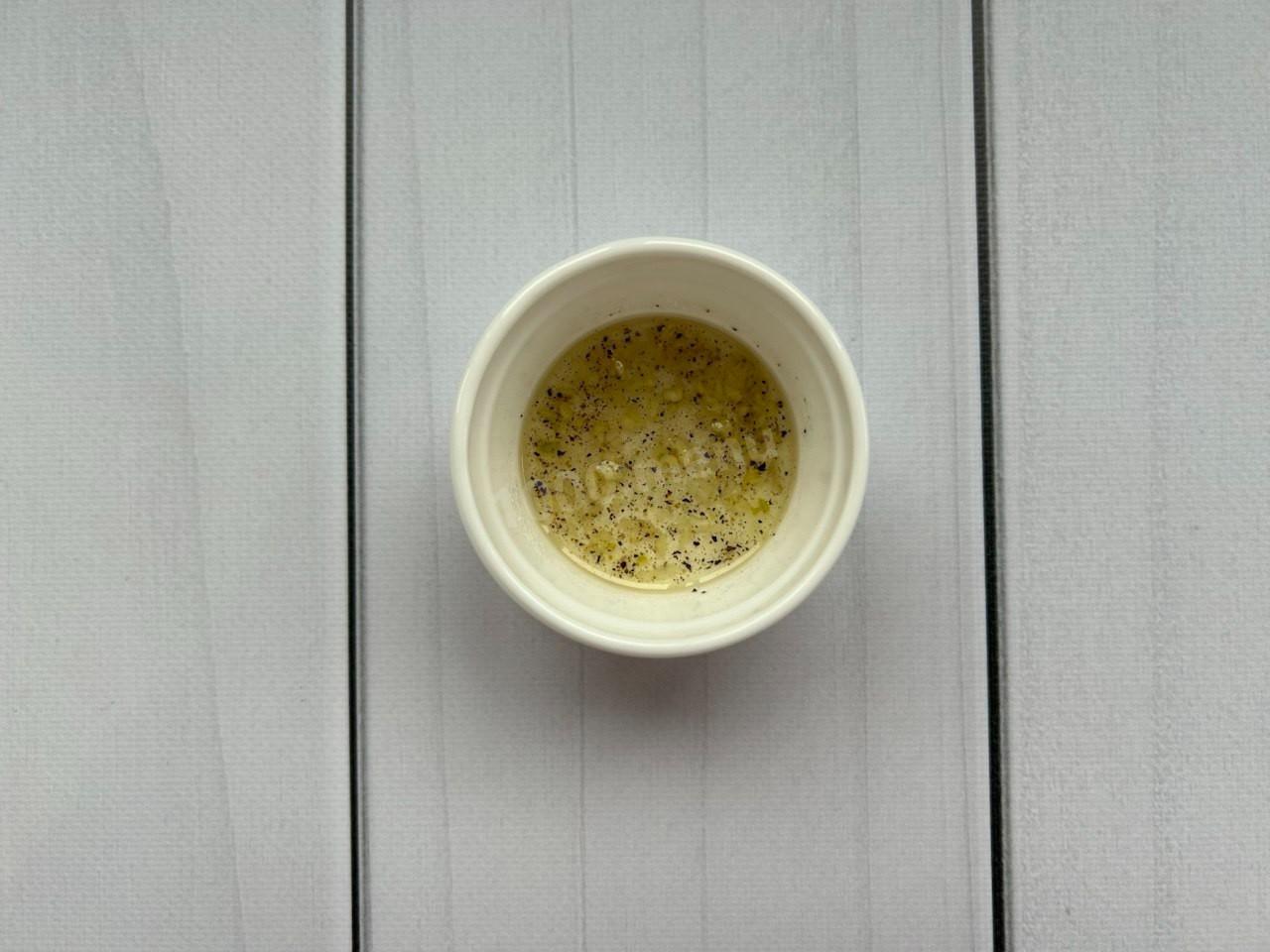 Для заправки зубчик чеснока пропустить через пресс. Смешайте в маленькой ёмкости масло, чеснок, щепотку соли и душистый перец (можно добавить немного молотого перца Чили).
