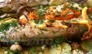 К такой рыбке отлично подойдет любая зелень или овощные салаты. Поэтому такое блюдо получается легкое и даже диетическое, его можно смело готовить на ужин, а оригинальное оформление подачи блюда прекрасно подойдет для романтического или праздничного ужина.