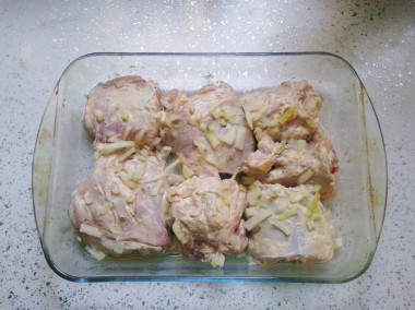 Выложите все куски маринованного кролика вместе с луком в заранее подготовленную форму для запекания. Накройте верх фольгой и поставьте форму в духовку, разогретую до 200 градусов на 2 часа. Последние минут 30 готовки снимите сверху фольгу и пусть мясо подрумянивается. Готовое мясо кролика подавайте сразу к столу, в качестве горячего блюда. При желании можно придумать к нему гарнир. Приятного аппетита!