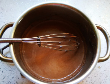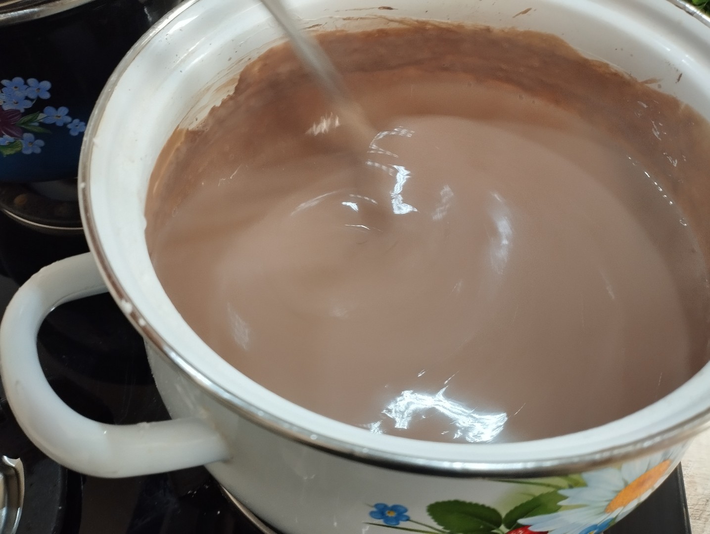 Добавьте в ковш холодную воду и перемешайте, чтобы порошок какао и крахмал равномерно перемешались. Затем поставьте ковш на небольшой огонь и нагрейте смесь, постоянно помешивая, до растворения ингредиентов.