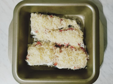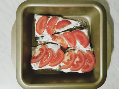 Смажьте филе сметаной. Или майонезом. Но в этом случае учтите, что калорийность блюда увеличится. Разложите на кусочки рыбы кружки помидоров. Старайтесь класть их так, чтобы каждый кружочек лежал на куске, тогда их будет легче разделять при подаче. Посыпьте все сверху тертым сыром.