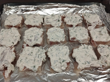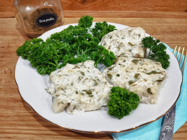 Приготовила филе минтая в сметане в духовке. Филе у меня было готовое, я его порезала на порционные кусочки и выложила на противень. Для сметанного соуса добавила в сметану измельчённую зелень петрушки, чеснок, соль,приправу для рыбы. Выложила соус на рыбу и убрала запекаться в духовой шкаф при 180° 30 минут.
