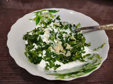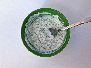 В глубокую тарелку переложите сметану, добавьте лимонный сок. Укроп промойте проточной водой, просушите полотенцем и мелко порубите. Используйте только листочки, грубые стебли удалите. Добавьте укроп к сметанному соусу. Чеснок очистите, помойте, просушите и пропустите через пресс. Добавьте чеснок к сметане.