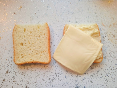 Поверх сыра положите по кусочку хлеба, полейте соусом бешамель. Твёрдый сыр натрите на крупной тёрке и присыпьте им бутерброды. Поставьте противень с крок-месье в духовку на 10 минут до расплавления сыра и появления аппетитной корочки.