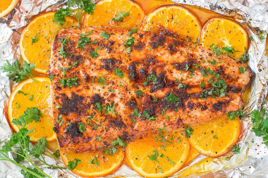 Отправьте филе в фольге в духовку, разогретую до 180 градусов, примерно на 20 минут (режим без конвекции). Точное время будет зависеть от особенностей вашей духовки. Узнать об особенностях работы духовок можно, прочитав отдельную статью, ссылка в конце рецепта. Рыба полностью готова, можно разворачивать фольгу и подавать к столу.