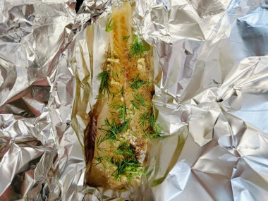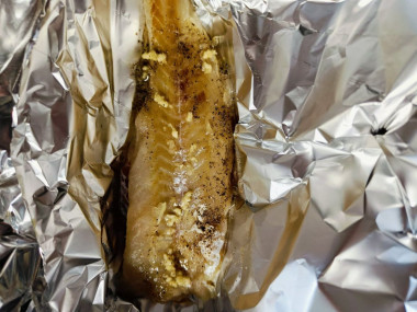 Сформируйте из каждого куска фольги небольшую лодочку. Выложите филе в фольгу, по одному на каждый кусочек. Полейте соком лимона, маслом, присыпьте солью и черным молотым перцем. Распределите чеснок и зелень по рыбе и заверните фольгу как можно плотнее, чтобы сок ,который будет выделяться из рыбы, и жидкая часть соуса не только не вытекли наружу, но и плотно обволакивали кусочек. Так рыба не пересохнет и получится нежной и сочной.