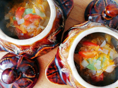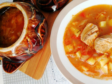 Взяла два горшочка на 0,5 л каждый. Выложила на дно нарезанную картошку, мясо, лук, капусту, лавровый лист. Залила всё бульоном . Томила щи из квашеной капусты в духовке в горшочке 2 часа при температуре 220°, ориентируясь на свою духовку.