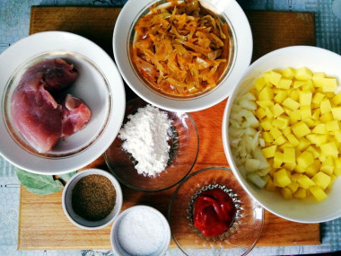 Как сварить щи из квашенной капусты в духовке в горшочке? Подготовьте все продукты, необходимые для рецепта. Мясо можно использовать любое. Особо вкусный суп получится из говядины на кости. Капусту можно использовать квашенную с морковкой, так и без моркови.