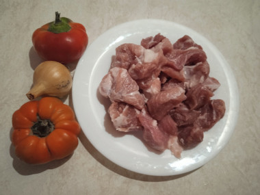 Как сделать мясо с болгарским перцем? Подготовьте продукты. Мясо выбирайте помягче — вырезку или шейку, тогда оно будет буквально таять во рту. Овощи можно использовать как свежие, так и замороженные. Так же дополнительно можете добавить морковь или кабачки. А для сытости — грибы. Приятно дополнит аромат блюда небольшое количество чеснока. Свинину помойте, обсушите и нарежьте на небольшие кусочки одинакового размера.