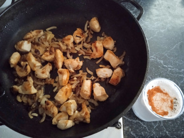 Добавьте нарезанный лук в сковороду к курице. Все перемешайте обжарьте еще пару минут на сильном огне. Затем сделайте огонь меньше, накройте сковороду крышкой и оставьте готовиться минут на 15-20. От лука выделится немного сока. Этого должно хватить, чтобы курица не начала погорать. Но если лук будет суховат, то подлейте немного воды. За это время курица успеет приготовиться, а лук станет очень мягкий.