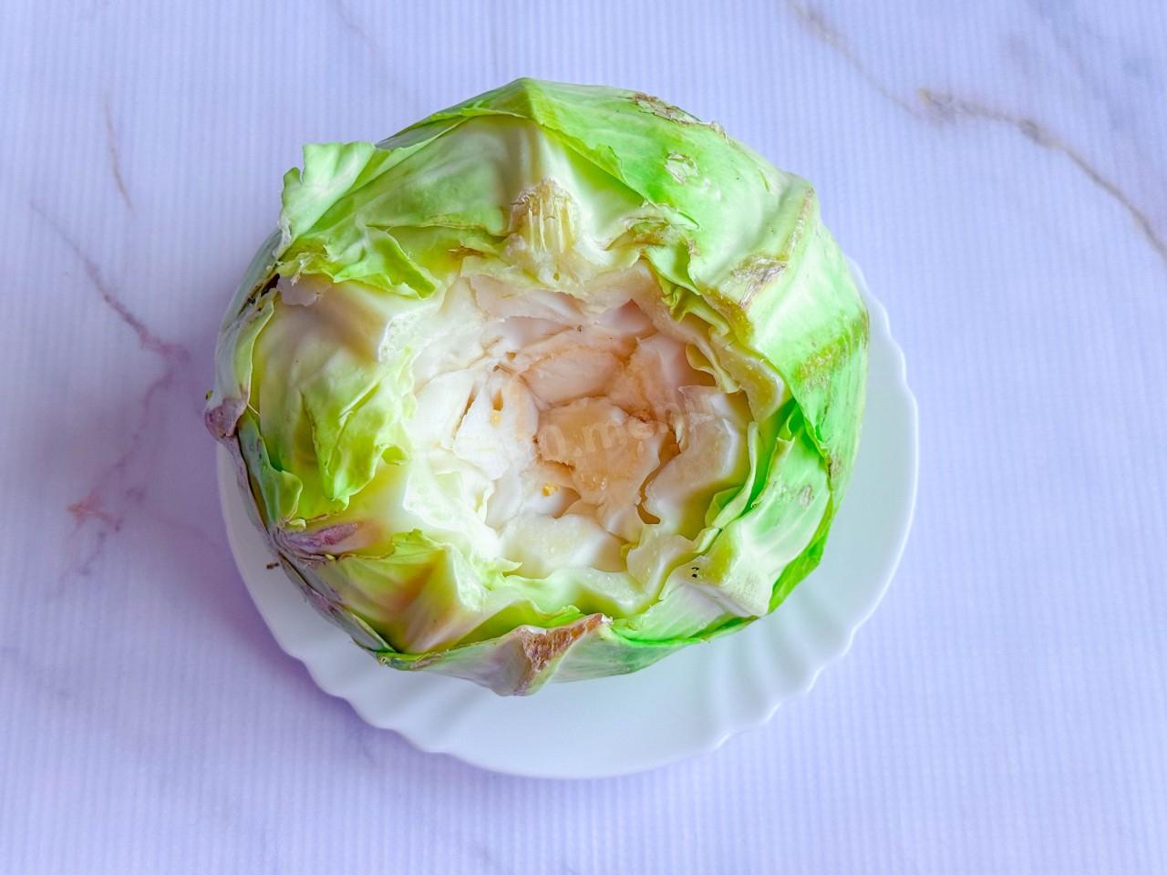 Подготовьте капусту. Упростит задачу альтернативный способ размягчения листьев в микроволновке. Для этого сделайте глубокие надрезы вдоль кочерыжки(или вырежьте ее) и отправьте капусту в микроволновую печь на 6-8 минут(зависит от мощности СВЧ). После сигнала, оставьте в СВЧ капусту остыть на несколько минут. Проверьте, если листья уже размягчились, достаньте, если нет, включите еще на 2 минуты.