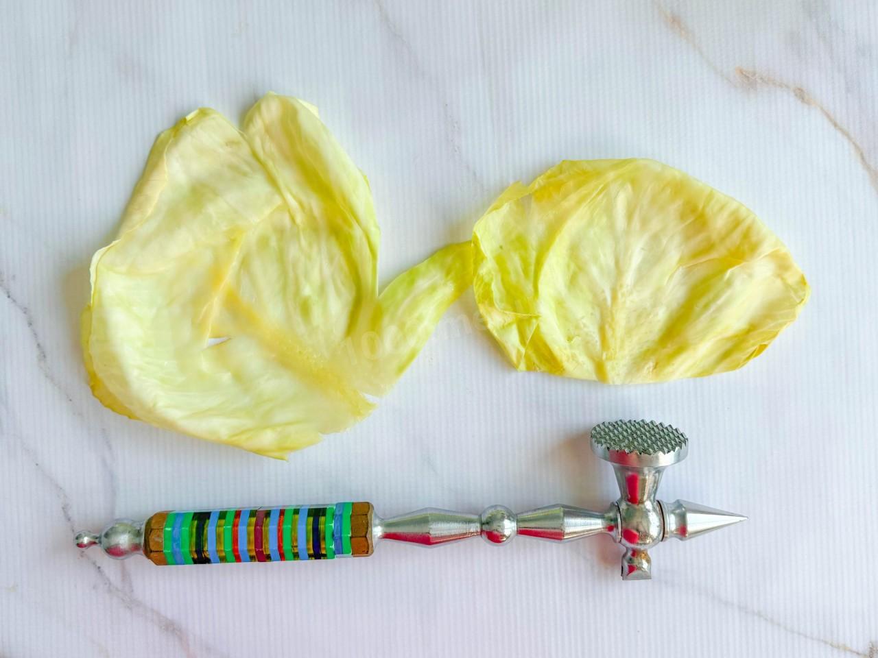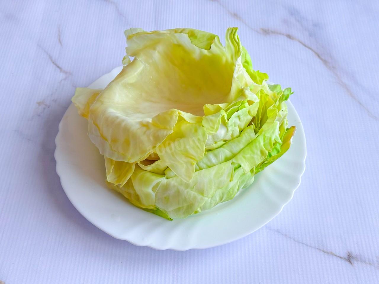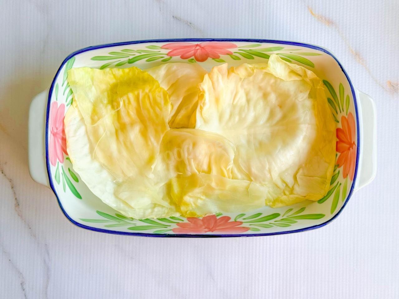 Затем достаньте капусту из микроволновки и отделите листочки. Сложите их стопочкой и верните в печь еще на 5 минут.