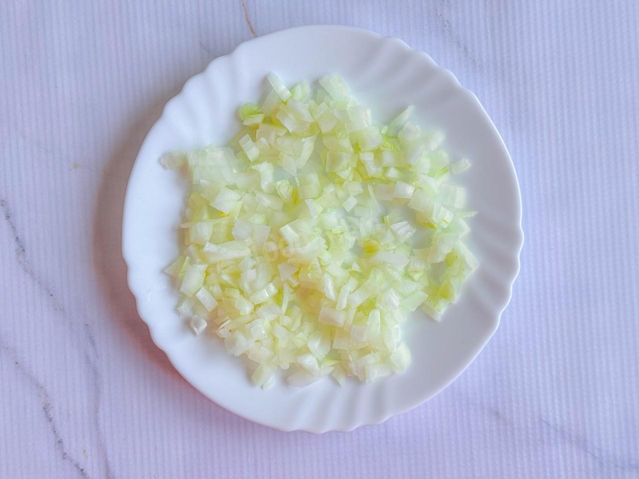 Лук очистите и нарежьте мелким кубиком. Поделите на две части, одна половина пойдет в начинку, а вторая в соус.