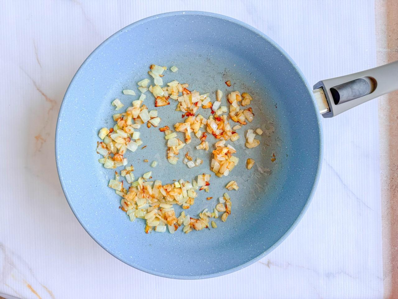 Обжарьте половину части лука на растительном масле до прозрачности.