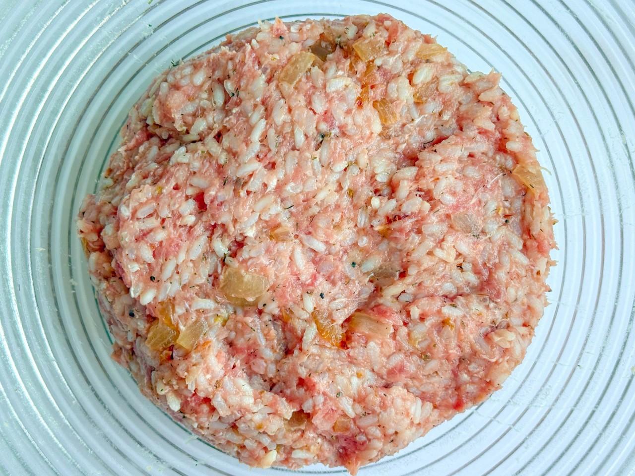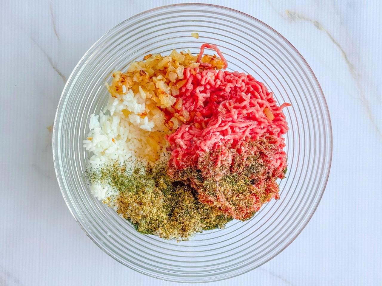 В глубокую миску выложите фарш, сваренный рис, обжаренный лук. Добавьте соль, молотый перец, сушеный укроп. Укроп можно заменить свежим, мелко нарезанным.