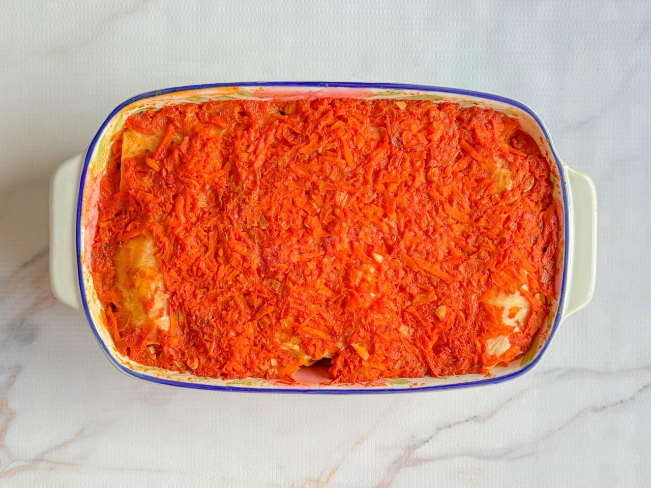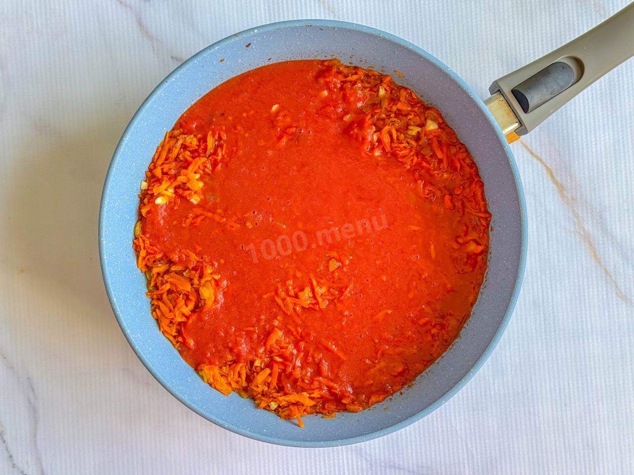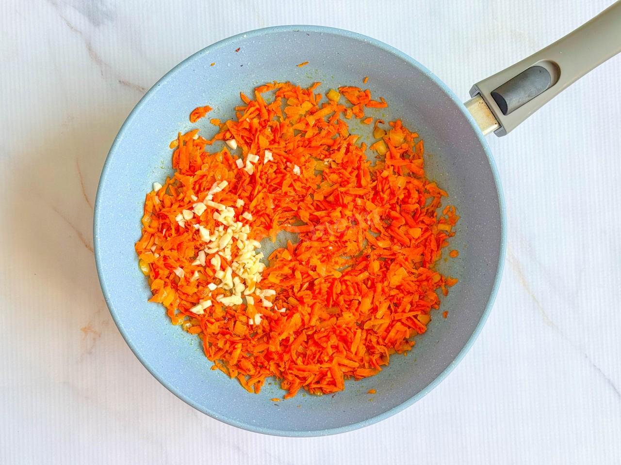 Приготовьте соус. На растительном масле обжарьте оставшийся лук. Морковь очистите и натрите на крупной терке. Отправьте ее в сковороду, когда лук размягчился. Чеснок пропустите через пресс/мелко порубите и добавьте к овощам.