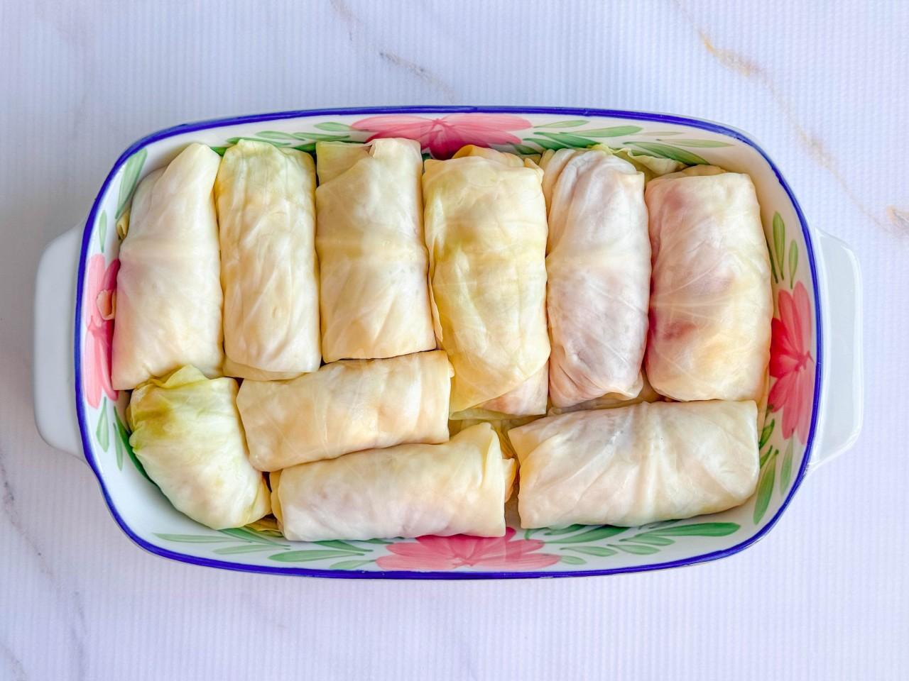 Разложите голубцы на противень/форму как можно плотнее друг к другу. Налейте между голубцами 100 мл воды.