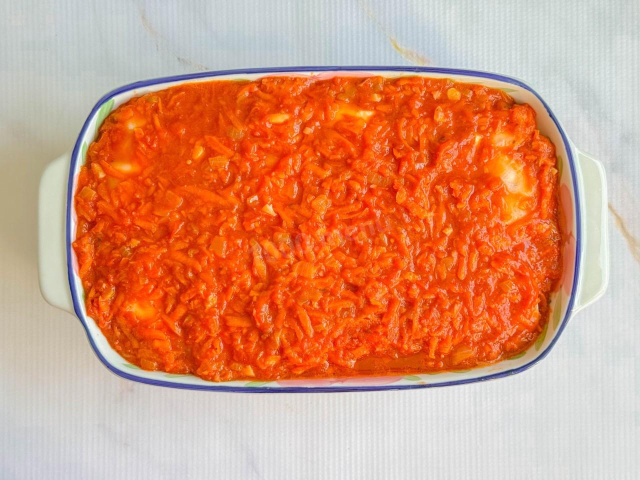 Сверху залейте томатным соусом.