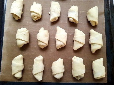 Духовку разогрейте до 220 градусов. Противень застелите пергаментом. На пергамент выложите заготовки рогаликов, оставляя между ними достаточно пространства, потому что во время выпекания рогалики значительно увеличатся в объеме. Взбейте в мисочке куриное яйцо и смажьте им рогалики сверху. Яйцо можно и не использовать, если вы планируете посыпать рогалики сахарной пудрой.