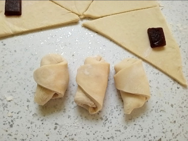 Сверните тесто с начинкой в рогалик. Аккуратно придавите его, чтобы рогалик не развернулся во время выпекания.