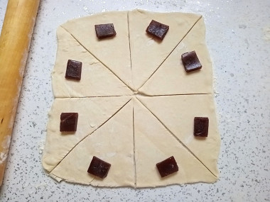 Лист слоеного теста немного раскатайте скалкой на присыпанном мукой столе, но не очень тонко, чтобы тесто в готовом изделии получилось слоеным и воздушным. С помощью тарелки или иного круглого предмета и ножа вырежьте из теста круг. Разделите его на восемь одинаковых кусочков.