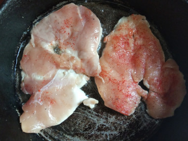 Куриную грудку ополосните и обсушите бумажными салфетками. Разрежьте каждый кусок мяса вдоль на две пластины. Посыпьте любимыми специями и посолите по вкусу с обеих сторон. Я использовала щепотку копчёной паприки, молотые перцы, чесночный порошок и сухой базилик. Разотрите специи по поверхности филе и оставьте мариноваться на 5-10 минут.