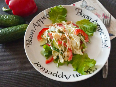 К ужину приготовила салат с жареной курицей. Куриное филе разрезала, натерла солью и любимыми специями, оставила промариноваться минут на 15, быстро обжарила ( получилось сочно и ароматно). Часть салата решила заменить пекинской капустой ( использовала только нежную часть капустных листьев, без толстых белых прожилок). Нарезала и смешала всё ингредиенты, заправила салат майонезом - отличный вариант лёгкого, но сытного ужина готов! Маринованное в специях и обжаренное куриное филе прекрасно сочетается с овощами, значительно обогащает вкус салата.Получилось очень сочно и вкусно! Спасибо за рецепт, Жемчужинка! С удовольствием буду готовить по этому рецепту, всем понравилось!