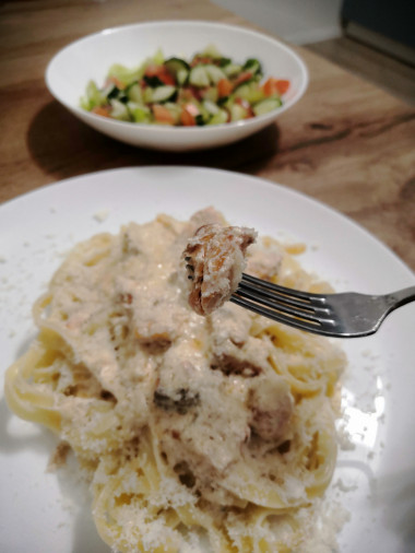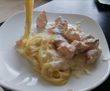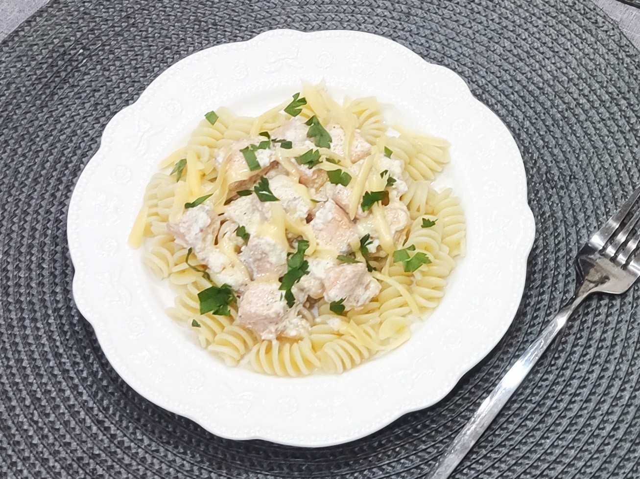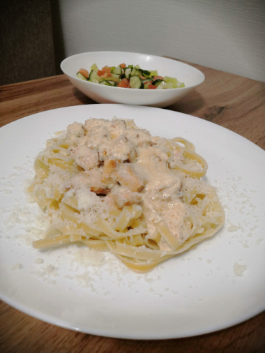 Паста с семгой в сливочном соусе – источник белка, омега-3 и кальция.
