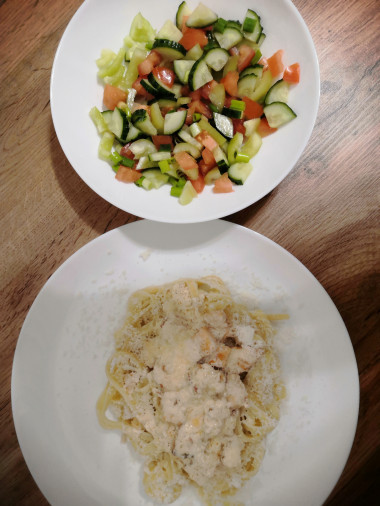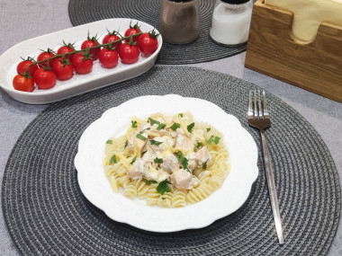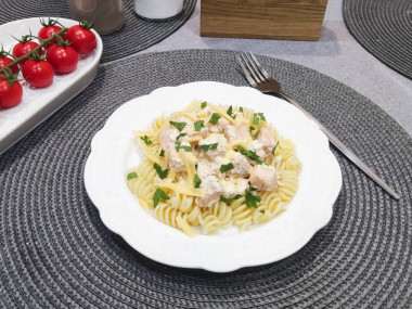 Очень любим красную рыбку, хотелось попробовать новый для нас рецепт. Паста с сёмгой в сливочном соусе превзошла все ожидания! Особая благодарность за наводку на чесночное масло - до этого с ним знакома не была. Чеснок перед обжариванием разрезала пополам для наибольшего аромата. Запах просто нереальный! Аппетит пробудился уже на стадии обжаривания чеснока) Специи я взяла свои любимые - мускатный орех, паприка, сушёный базилик. У меня были сливки 20% жирности - идеально подошли к рыбке. В семье все большие любители сыра, поэтому сыр я добавила в соус, а затем им и сверху посыпала готовое блюдо. Макароны, я думаю, подойдут любые к этому блюду, у меня - фузилли. Перед подачей блюдо посыпала нарезанной петрушкой - для аромата и эстетики. Получилось безумно вкусно! Однозначно рекомендую этот рецепт - быстро, вкусно, полезно.