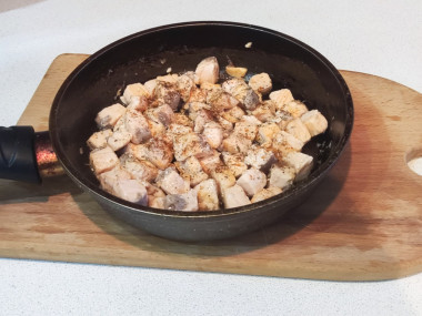 Выложите нарезанную рыбу в ароматное масло и обжаривайте на среднем огне, помешивая со всех сторон, около 5 минут.