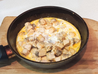 Влейте к рыбе жирные сливки (они должны на половину прикрывать кусочки рыбы), перемешайте и тушите на медленном огне 7-10 минут. В этом шаге по желанию вы можете добавить натёртый твёрдый сыр непосредственно в соус, перемешать его и сразу подавать. А можете посыпать сыром уже готовое блюдо с макаронами.