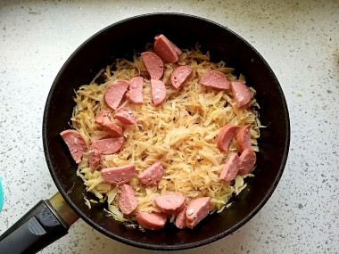 Добавьте соль и черный молотый перец по вкусу, перемешайте. Можете добавить любые любимые специи. Если в капусте осталась вода, то снимите со сковороды крышку и подержите ее так около 5 минут, до полного выпаривания жидкости. Отправьте в сковороду с капустой приготовленную колбасу. Перемешайте, снова накройте сковороду крышкой. Жарьте капусту с колбасой еще около 5-7 минут, периодически перемешивая их лопаткой, пока колбаса не зарумянится.