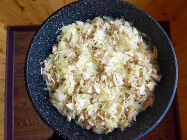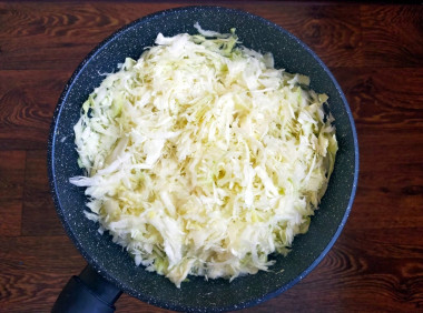 Выложите на масло нашинкованную капусту. Влейте пару столовых ложек воды. Включите огонь. Сковороду накройте крышкой. Тушите капусту на среднем огне около 10 минут. Затем перемешайте ее. Капуста должна стать мягкой и осесть, уменьшиться в объеме. Количество жидкости при этом немного увеличится, потому что капуста пустит сок. Снова накройте сковороду крышкой и потушите капусту еще около 10 минут.