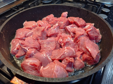 Говядину вымойте. Обязательно обсушите бумажным полотенцем, иначе излишняя влага не даст ему обжариться - оно будет тушиться. Нарежьте средними кусочками. Если используете замороженное мясо, необходимо предварительно правильно его разморозить на нижней полке холодильника. У меня был уже нарезанный говяжий гуляш. Также подойдет любая мякоть без жестких жил.