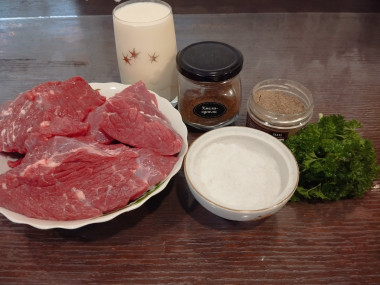 Как сделать говядину в молоке на сковороде? Очень просто! Для начала подготовьте необходимые ингредиенты по списку. Чтобы мясо получилось сочнее, лучше использовать мякоть свежей говядины или телятины. Помимо соли и перца можете добавить свои специи по вкусу. Я добавила немного хмели-сунели. Растительное масло берите любое. У меня подсолнечное.