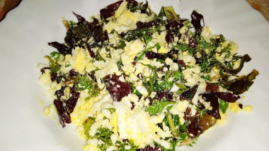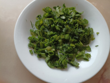 Выложите обжаренные яйца в тарелку и немного остудите. Добавьте к яичной массе нарезанную зелень и перемешайте.