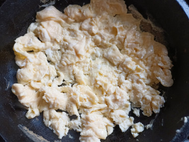 На сковороде разогрейте растительное масло. Вылейте на сковороду взбитые яйца, и активно помешивая, обжарьте на умеренном огне до готовности. Яичная масса будет похожа на хлопья. О том, как подобрать идеальную сковороду, а также как правильно выбрать масло для жарки, читайте в отдельных статьях, ссылки в конце рецепта.