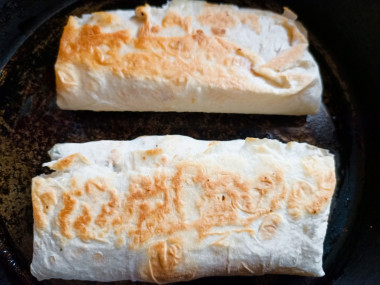 На сковороду подходящего размера добавьте растительное масло. Обжарьте конвертики лаваша с одной стороны до румяности.