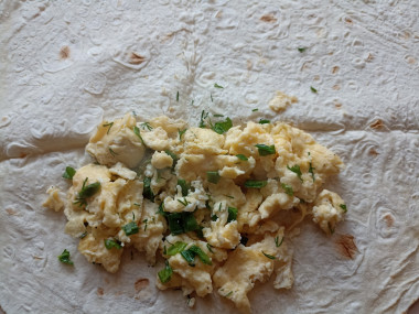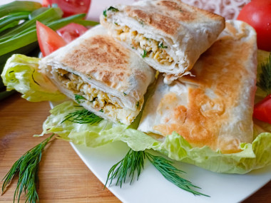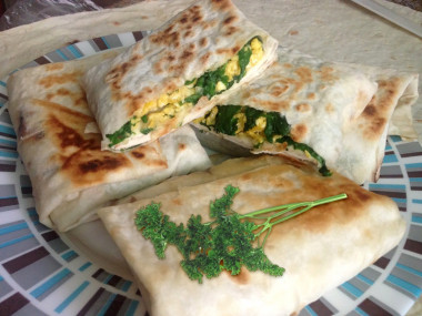 На завтрак приготовила лаваш с яйцом и зеленью на сковороде. Яйца вилкой взбила с солью до однородности, обжарила при помешивании на сковороде. Нарезала зелень ( укроп, петрушку и зеленый лук), смешала с обжаренными яйцами. Полученную смесь завернула в лаваш в форме конвертика и обжарила на сковороде с небольшим количеством растительного масла с обеих сторон до зарумянивания. Можно конечно добавить в начинку сметану или майонез, либо смазать ими листы лаваша для сытности и сочности, но мне понравился этот вариант, менее калорийный. После обжарки конвертики приобретают очень аппетитную хрустящую корочку. А сочность будет обеспечена если подавать лаваш со свежими овощами. Спасибо за рецепт, Юлия!