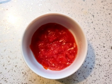 Как сделать маринад для свиных ребрышек? Подготовьте необходимые ингредиенты. Спелый помидор вымойте, удалите у него плодоножку и нарежьте крупными кусочками. Отправьте его в чашу блендера, вместе с очищенными зубчиками чеснока и итальянскими травами. Измельчите овощи блендером сначала в импульсном режиме на низких оборотах, а затем постепенно увеличивая скорость, добиваясь однородности смеси.