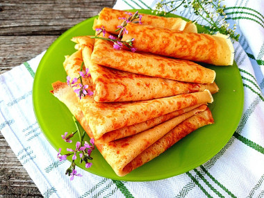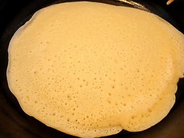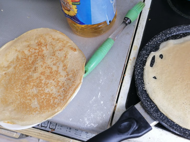 Сковороду раскалите на плите и смажьте растительным маслом. Влейте немного теста на сковороду, поворачивая ее распределите тесто по всей поверхности и обжаривайте блинчик с двух сторон до золотистого цвета на умеренном огне. Для обжарки следующих блинов смазывать сковороду маслом не нужно.